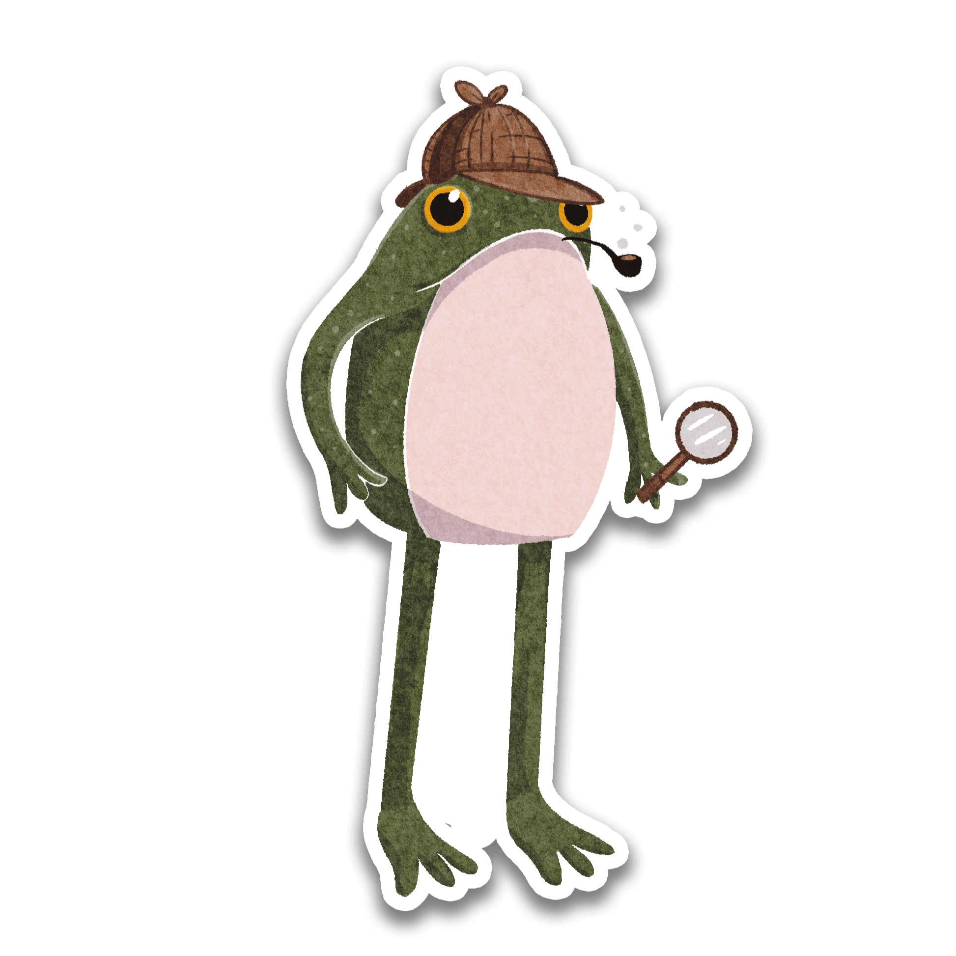 Detective Frogson is on the case! With his detective hat, pipe, and magnifying glass, he’s solving the mysteries of your daily life. Stick this vinyl sticker on your favorite water bottle or laptop for a touch of investigative flair.