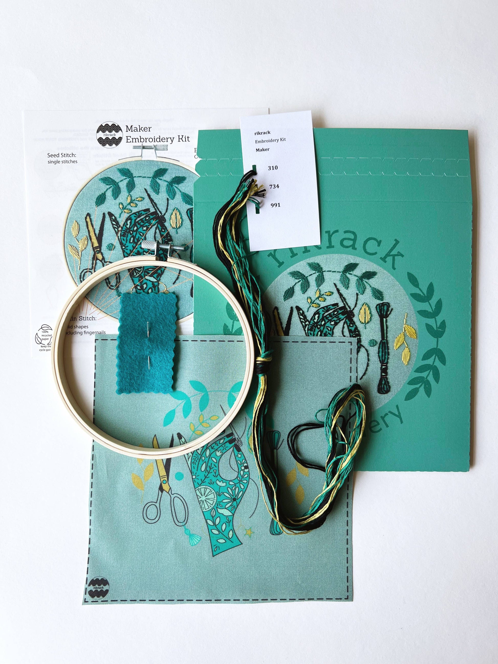 Kit comes with hoop, needle, floss, preprinted fabric and instruction card. Rikrack embroidery kits are not just beautiful and unique but also fun and simple to stitch. You can find lots of tips for your kit at rikrack.com