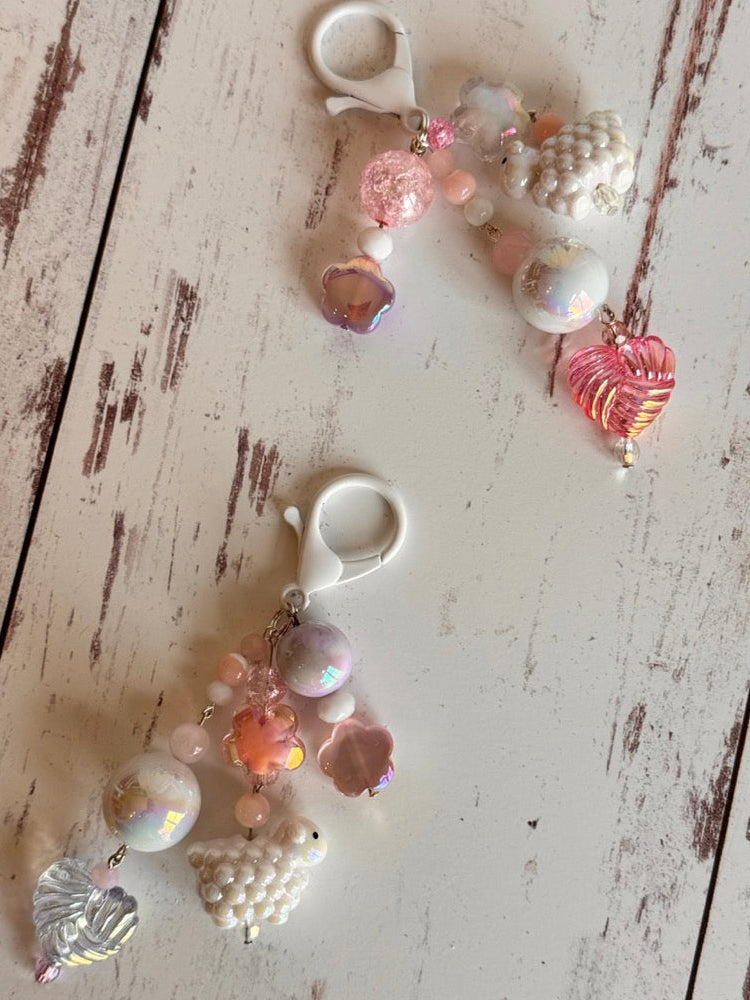 An assortment of glass, plastic, and semi-precious stones in a bauble charm bundle on a white enamel coated metal clasp. This beautiful charm set would be great on a keychain or dangling from a bag, purse, or craft pouch. Each individual set comes with a sweet sheep and yarn heart charm.